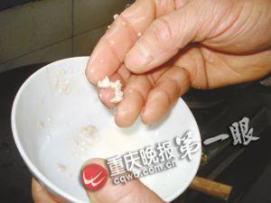 隨后,記者在家中用面條做實驗,發現面條浸水發脹后有點粘稠,搓揉后發黑現象沒有胡夕模做實驗時那么明顯。