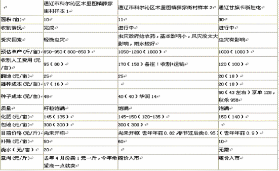 租地費用:上漲約25%農藥費用:上漲約20%整地成本:上漲約60%種子成本:上漲約為16%化肥成本:上漲約7%人工成本:上漲約為20%預估單產:上漲約為10%由于氣候因素影響,內蒙古通遼地區玉米的單產整體低于遼寧和吉林,通遼地區今年天氣較好,玉米單產增加明顯,從我們調研的樣本來看,受蟲害影響的地區產量略微受到影響,而采用農藥合理處理以后,單產依然較好,部分地區單產甚至提高20%。生產成本增加在通遼地區的表現也比較明顯,主要體現在收割的人工成本以及生產資料成本上,如去年的人工收割費用為80元/畝,而今年上漲至95元/畝,化肥和農藥等成本也有不同幅度的增加。今年內蒙古地區玉米整體增產50-100萬噸。全國產量小結
