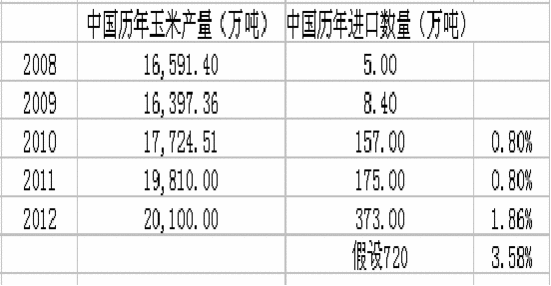 通過歷年來中國玉米進口數據的比較,進口僅占中國年消耗量的比例很低,中國玉米處于自給自足的緊平衡狀態,因此外圍美玉米的價格變化對中國國影響有限。