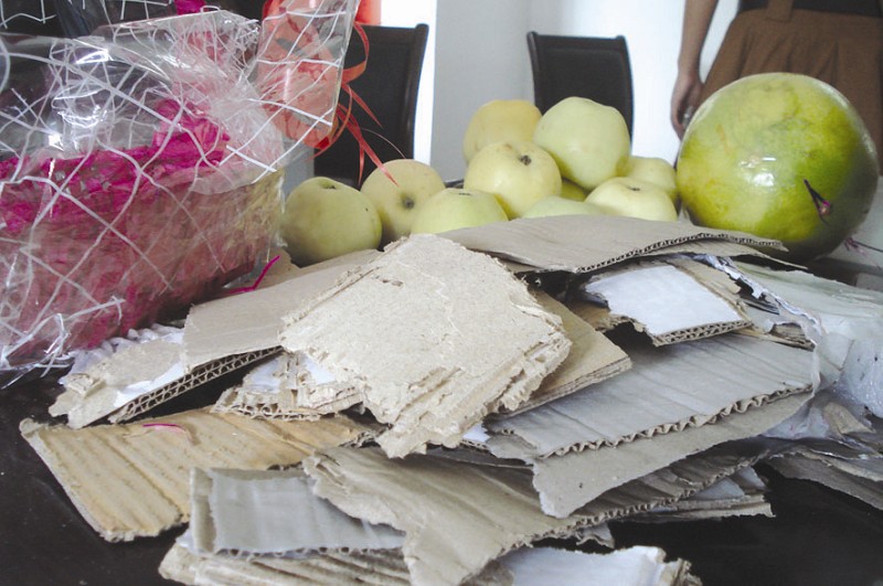 前日上午,剛出院的張先生把朋友送的水果籃提到單位,準備分給同事吃,水果籃的包裝看上去很精美,分量很充足,可拆開后才發現,水果籃底部墊了厚厚一疊紙,細細一數,竟有10多層,10多厘米厚,占據了籃子的大部分空間。紙板全部拿出來后,在桌子上鋪了一大堆。籃子里放著11個小蘋果、4個紅布林和1個小柚子,而且食用后感覺柚子的味道并不太好。
