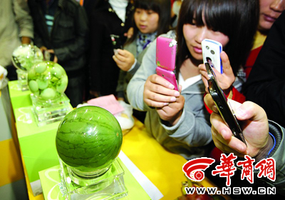 昨日中午,在十七屆農(nóng)高會高新技術(shù)館(A館)內(nèi),一只被“裝”在玻璃球里的西瓜吸引了眾多參觀者的目光。