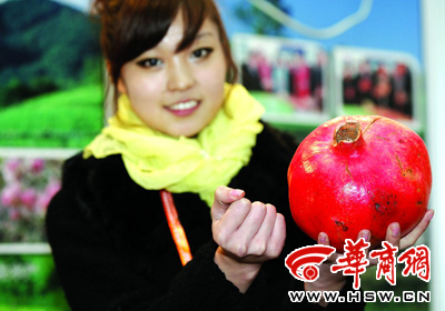 昨日,第十七屆農(nóng)高會國際館(C館)內(nèi),工作人員向參觀者展示大籽石榴。這種石榴是從禮泉昭陵御石榴中選育的甜酸型超大果個、超大籽粒石榴株變新品種。最大單果重2.8公斤,平均單品果重1.2公斤。