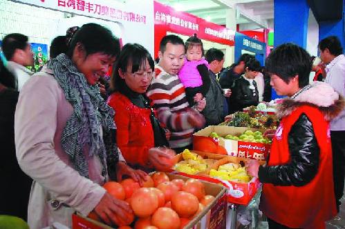在臺灣屏東縣蔬果生產合作社攤位前,永康市民爭相選購文旦、西柚、芒果、楊桃、蓮霧、釋迦等10多種臺灣特色水果。該合作社負責人洪定瑜難掩喜色:“臺灣水果剛進來就賣得這么好,看來我們這次‘空降’永康是走對了路。”