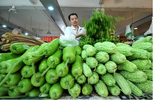 2011年8月2日,江西南昌市新建縣文化路集貿市場一名攤主在擺放蔬菜。近期,受晴熱天氣影響,江西全省蔬菜長勢良好,供應增多,蔬菜價格出現下跌。生活必需品市場運行平穩,豬肉價格漲幅也明顯趨緩。據江西省有關部門監測數據顯示,豬肉零售價格環比微漲0.78%,漲幅明顯趨緩;蔬菜批發價格環比下跌1.02%,其中蒜頭和白蘿卜跌幅較大,分別下跌14.63%和8.33%。