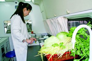 市場內還有快速流動檢測車,“這是北京市科委研發的科研項目,新發地率先引進,為的是更好地做好食品安全工作。”在這輛快速檢測車內,有相應的檢測設備,可以做蔬菜、水果中的農藥殘留檢測。張月琳說,“我們每天都會對市場內上市的蔬菜、水果進行抽樣檢測,檢測200多批次,100多個品種,提高了工作效率,增加了檢測的透明度。”記者看到,檢測車上有一臺快速檢測儀、振蕩器以及配件箱,主要檢測項目為農藥殘留(有機磷類和氨基甲酸酯類)。樣品在檢測前,同品種的抽檢樣品,分產地的樣品都要抽樣檢測。此外,每個樣品的名稱、產地、車牌號、貨主姓名都要一一做好記錄。