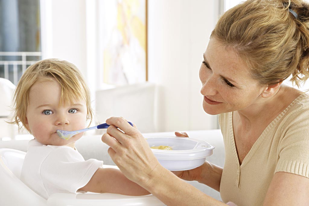 喂寶寶輔食時準備四把勺子,兩把給寶貝,兩把給自己。當寶貝們第一次吃固體食物的時候,幼兒往往咬住勺子然