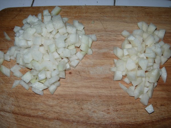 首先準(zhǔn)備蘿卜和梨,適量切小丁
