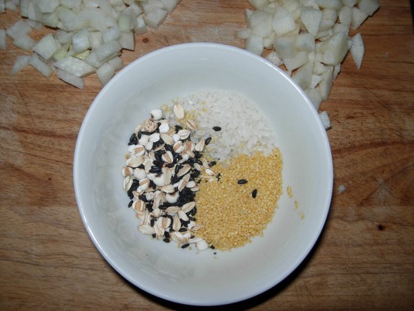 取適量核桃和玉米、還有提前泡好的黃豆,小米、大米、黑米、麥片等,這些就隨自己喜歡了,隨意選擇添加各種谷物,只要你覺的有營養(yǎng)的都可以放些。