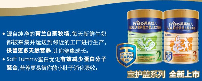 美素佳兒奶粉是世界領先專業乳品公司源自荷蘭的皇家富仕蘭旗下的品牌,公司擁有專屬綠色牧場,培育荷蘭純種荷斯坦奶牛,嚴格保證奶源的單一性和純正度。奶粉采用歐洲領先配方,含有所有寶寶生長發育所需的維生素和礦物質,采用獨特的蛋白質疏松處理技術,并添加益生元、5種核苷酸、DHA和AA,相伴寶寶一路健康快樂成長。