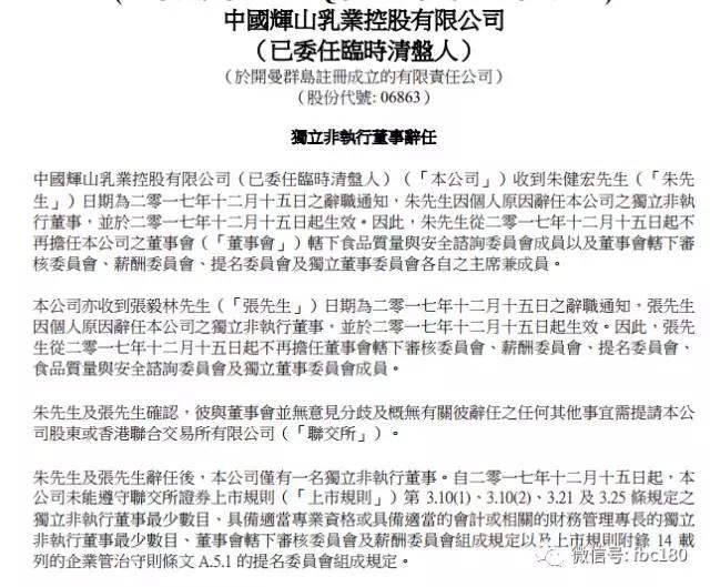昨日,中國輝山乳業(yè)控股有限公司(以下簡稱輝山乳業(yè))發(fā)布公告,朱健宏先生、張毅林先生因個人原因辭任公司獨(dú)立非執(zhí)行董事職位,在職期間約半年(2017年06月22至12月15日)。至此,輝山乳業(yè)僅有一位獨(dú)立非執(zhí)行董事,已不足聯(lián)交所證券上市規(guī)則的人數(shù)要求。