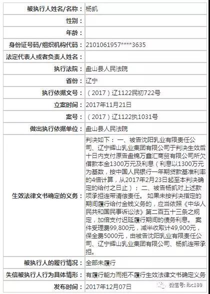 同日(12月19日)恒生銀行向香港高等法院提交訴狀,尋求輝山乳業(yè)支付2960萬美元尚未償還的本金和243086美元的拖欠利息。而董事長楊凱本人則在近日被遼寧省盤山縣人民法院判決入“老賴”名單。