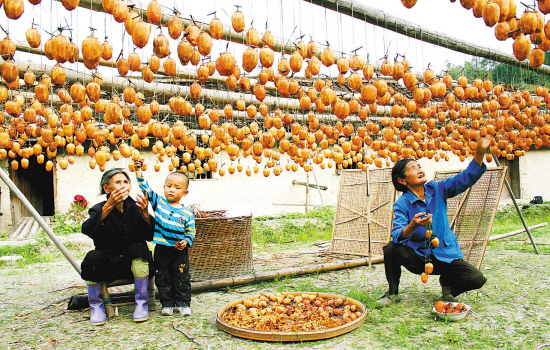 金秋十月,云和縣赤石鄉(xiāng)庫(kù)北店子村漫山遍野一片金黃,上萬(wàn)斤柿子成熟了。村民通過(guò)傳統(tǒng)手法煮、焙、烘、曬,精制而成的柿干深受市民喜愛,一只柿干能賣2元錢。