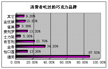 吉百利在消費(fèi)者吃過的巧克力品牌中排名第三位,只占21.7%。吉百利在北京巧克力市場的市場份額居第二位,但其品牌記憶度卻落在金帝巧克力之后排在第三位,這種現(xiàn)象值得吉百利去認(rèn)真思考、分析其背后的原因。進(jìn)入消費(fèi)者吃過的巧克力品牌前4-8位的依次是費(fèi)列羅占13.3%。怡口蓮占13.3%,金絲猴占10.8%,士力架占5.0%和雀巢占3.3%。