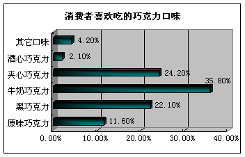 消費(fèi)者最喜歡吃牛奶口味的巧克力,占被調(diào)查人數(shù)的35.8%;其次是夾心巧克力,占22.4%;排在消費(fèi)者喜歡吃的口味第三位的是黑巧克力,占22.1%。往下依次是原味巧克力占11.6%,酒心巧克力只占2.1%,其它口味占4.2%。從以上調(diào)查數(shù)據(jù)可以看出,消費(fèi)者喜歡吃的三種口味的巧克力產(chǎn)品分別是牛奶巧克力、夾心巧克力和黑巧克力。該項調(diào)研結(jié)果可以為巧克力生產(chǎn)企業(yè)的產(chǎn)品線規(guī)劃提供市場依據(jù)。