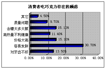 通過對消費(fèi)者的調(diào)查,我們發(fā)現(xiàn)容易發(fā)胖和價格太高是消費(fèi)者吃巧克力的主要顧慮,分別達(dá)到30.7%和15.1%。消費(fèi)者吃巧克力產(chǎn)品存在的顧慮還包括含糖太多太膩占15.1%,對牙齒不好占13.5%,高熱量不利健康占11.4%,擔(dān)心質(zhì)量問題占9.7%,其它顧慮只占4.5%。消費(fèi)者的顧慮其實就是巧克力生產(chǎn)企業(yè)需要解決的產(chǎn)品問題。只有盡可能不斷改進(jìn)產(chǎn)品質(zhì)量,根據(jù)消費(fèi)者需求不斷研發(fā)新產(chǎn)品才能逐步做大市場,做強(qiáng)品牌。