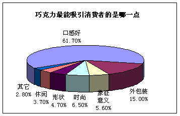 調(diào)查結(jié)果顯示巧克力產(chǎn)品最能吸引消費(fèi)者的就是口感好,比率高達(dá)61.7%;其次才是外包裝,占15.0%,遠(yuǎn)低于排在第一位的口感好的比率。往下依次是時尚占6.5%,象征意義占5.6%,巧克力產(chǎn)品包裝的形狀占4.7%,其它能吸引消費(fèi)者的因素只有2.8%。可見巧克力產(chǎn)品要想賣的好,口感是關(guān)鍵因素。
