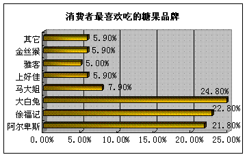 調查結果顯示,在消費者最喜歡吃的糖果品牌中,大白兔排名第一位,比率為24.8%;徐福記以22.8%的提及率排在第二位;阿爾卑斯在北京消費者最喜歡吃的糖果品牌的第三位,占21.8%。如圖所示大白兔、徐福記和阿爾卑斯三足鼎立,占據北京消費者最喜歡吃糖果的前三甲,品牌提及率遠遠高于其它品牌。在這三個品牌中表現最突出的就是徐福記,