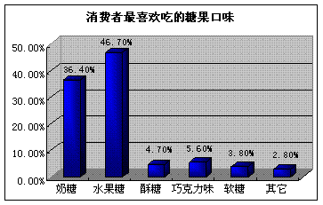 通過對消費者的實地問卷調查,我們發現消費者最喜歡吃水果口味的糖果,占被調查 對象的46.7%;其次是喜歡吃奶糖,占36.4%。水果糖和奶糖兩種口味合計占83.1%,可見水果口味和牛奶口味的糖果是絕大多數消費者首選的糖果口味。最喜歡吃巧克力糖、酥糖、軟糖和其它口味糖果的消費者比率很少,分別只占5.6%、4.7%、3.8%和2.8%。
