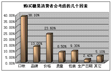 調查顯示,購買糖果消費者會考慮的前三個因素是口味、價格和品牌,分別占38.1%、23.6%和13.0%。往下依次是產品包裝占9.3%,質量占8.5%,生產日期占2.4%,其它因素占5.1%。從這項調查結果我們可以看出,口味好,價格適中,有較高品牌知名度,包裝新穎的糖果產品代表了消費者的需求方向。