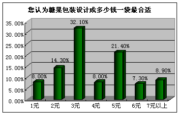 從該項調查圖表中可以清晰的看出,有32.1%的消費者認為糖果設計成3元一袋的包裝最合適,排在消費者選擇比率的第一位;其次是設計成5元一袋的包裝,占21.4%;排在第三位的是認為糖果產品設計成2元一袋的包裝最合適,占消費者選擇比率的14.3%。同時認為糖果產品設計成1元、4元、6元和7元以上一袋的包裝最合適的分別為8.0%、8.0%、7.3%和8.9%,消費者選擇比率很低。調查結果表明,3元、5元和2元一袋的糖果包裝是最合適消費者需求的。