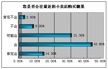 對于糖果產品,除了超市這樣的大賣場外,社區的小超市、小賣店和學校附近的小商店都是其重要的銷售渠道。通過對消費者購買糖果產品的地點的調查結果顯示,如果在您家最近的小賣店能購買到您滿意的糖果產品,您是否會購買?有43.8%的被訪對象表示會購買,占選項比率的第一位;回答可能會的占31.3%, 居第二位;回答肯定會的占14.3%,居消費者選擇比率的第三位。回答不會和肯定不會的合計只有10.6%。表明社區小賣店是有一定品牌知名度,質量、口味好,小包裝和價格合適糖果產品的重要銷售終端。