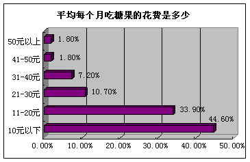 在我國糖果的消費量不僅遠低于西方發達國家,而且比全球人均消費量還要低得多。在北京消費者每月吃糖果的花費在20元以下的比率合計達到78.5%。每月吃10元以下糖果花費的消費者比率最高,占44.6%,其次是每月消費11-20元的占33.9%。每月吃21-30元糖果的消費者比率占10.7%,31-40元的占7.2%,41元以上的合計只有3.6%。糖果產品消費水平低也預示著未來的市場增長空間大,糖果這個小產品往往能做出大市場。