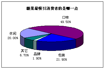 糖果產品包裝是臉面,口味好是根本。調查結果顯示,糖果產品最能吸引消費者重復購買的就是口味,也是最能吸引消費者的第一重要的因素,比率高達49.5%。包裝和休閑也分別占到21.9%和20.0%。其它能吸引消費者購買糖果的因素所占比率極少。可見對于糖果生產企業,產品的口味和包裝基本能決定您的品牌能走多遠,市場能做多大。