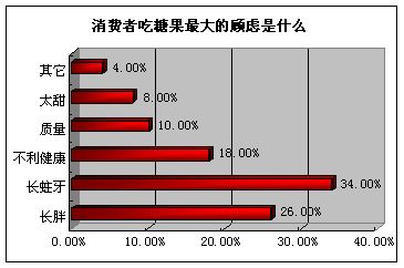 消費者吃糖果最大的顧慮是怕長蛀牙,占34.0%;其次是擔心長胖占26.0%;排在第三位的是認為多吃糖果不利于身體健康,占18.0%;擔心產品質量和認為糖果太甜的分別占10.0%和8.0%。任何種類產品都是有利就有弊,營銷策劃的目的就是要解決如何將產品的弱勢化解,甚至將產品的弱勢演變成產品的優勢。