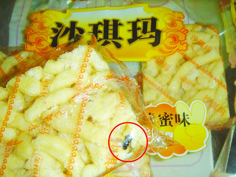 紅圈內的黑點即是蒼蠅 雖然沒有吃到蒼蠅,但是在沒開封的沙琪瑪里看到一只蒼蠅也夠惡心的了。昨天,市民馬先生發現購買的沙琪瑪內有一只完整的蒼蠅。超市核實情況后給予了雙倍賠償。 昨天,市民馬先生致 電 本 報 報 料 熱 線2639333稱,上月他在家樂福超市花8元購買了