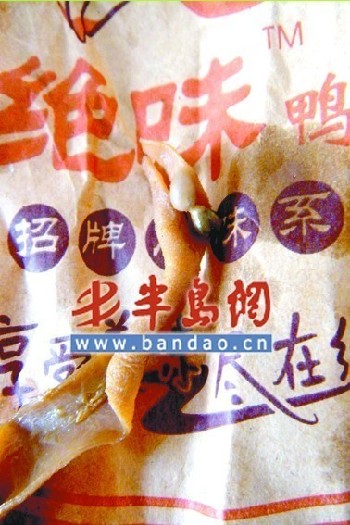徐女士說,回到家后,她還沒吃幾口鴨腸就發現了問題。鴨腸里有圓形的小顆粒,剛開始以為是花椒,仔細一看是黏在鴨腸內壁上的,一顆一顆的,顏色有黑有白;聞一聞鴨脖,也有一股酸味。“太惡心了 ,這讓人怎么吃。所以兩包東西我基本沒動,用相機拍了照片直接傳到網上去了 。”之后,徐女士上網查詢,發現遇上這種情況的人不少。至于鴨腸內壁上的疙瘩究竟是什么東西,有人說是沒清洗干凈的淋巴結,有人說是寄生蟲 。