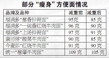 其中,多數袋裝方便面的面餅凈重都跌破了90克大關。如福滿多“蔥香排骨面”原來是面餅95克,8月份生產的就變成85克,“一碗香紅燒牛肉面”從96克減到了90克,福滿多“上湯排骨面”從97克減到了91克。康師傅“酸菜牛肉面”原來重90克,現在只剩85克。今麥郎“紅燒牛肉面”91克的面餅也變為90克。統一“蔥爆牛肉面”從109克減到了105克。記者了解到,這些品牌的方便面無論是袋裝的還是桶裝的,價格都未出現變化。