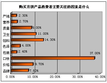 購買月餅產品時,消費者最關注的因素中產品的口味排在第一位,占消費者選擇比率的37.0%,遠高于其它關注因素。消費者購買月餅關注的因素往下依次是月餅產品的餡料占14.3%,衛生占11.0%,價格占9.7%;月餅的質量和品牌分別占9.0%和7.6%。其它關注因素的選擇比率很少。可以看出,購買月餅消費者最關注的因素是口味,同時產品的餡料、衛生、價格、質量和品牌也是消費者購買月餅時關注的重要因素。