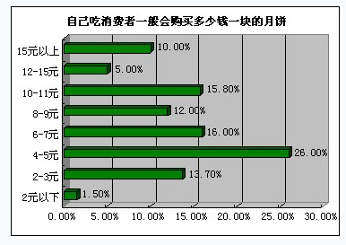 購買月餅自己吃時,消費者對月餅產品的價格接受程度差異非常大。調研結果顯示,消費者在購買月餅自己吃時,一般會選擇每塊4-5元價位月餅的比率最高,占26.0%;其次是一般會購買每塊6-7元的月餅,占消費者選擇比率的16.0%;表示一般會購買每塊10-11元月餅的消費者比率占15.8%;選擇每塊2-3元和8-9元月餅的消費者比率分別為13.7%和12.0%。同時也有10.0%的消費者表示一般會選擇價格在15元以上的月餅產品。從該項調研結果不難看出,消費者對月餅產品的價格接受區間主要在2-11元之間,可見消費者對月餅產品的價格接受程度差異非常大。