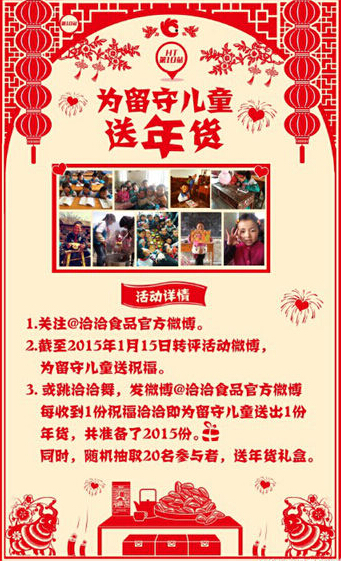 洽洽食品為留守兒童帶去關懷,以一份企業的社會責任心回報社會。近日,洽洽食品推出“為留守兒童送年貨”的公益活動。在活動視頻中,一名可愛的小女孩號召人們關注貧困地區的留守兒童,并為他們送上新年祝福。活動承諾,每收到一份祝福,洽洽食品就會為孩子們送出一份年貨,總計2015份年貨。