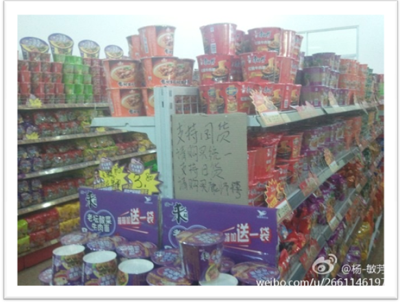 廝殺戰(zhàn)場開始蔓延到謠言攻擊上。2012年9月,網(wǎng)上開始大量流傳康師傅為日資企業(yè)的謠言,且在店內(nèi)張貼海報,指康師傅是日資企業(yè)煽動消費者拒買其產(chǎn)品,殺傷力之強(qiáng)甚至一度造成康師傅業(yè)績下滑。雖然幕后推手沒有最終定論,后續(xù)康師傅起訴湖北孝感統(tǒng)一的員工周某,最終勝訴,期間周某承認(rèn)利用微信朋友圈轉(zhuǎn)帖是公司安排。這一系列事件皆為商業(yè)惡意競爭的手段。