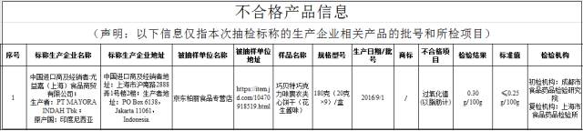 印度尼西亞PT MAYORA INDAH Tbk生產的巧貝特巧克力味裹衣夾心餅干(花生醬味),過氧化值(以脂肪計)檢出值為0.30g/100g,比國家標準規定(不超過0.25 g/100g)高出20%。