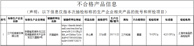 公告顯示,天貓超市在天貓(網站)商城銷售的標稱三只松鼠股份有限公司2017年1月22日生產的開心果,霉菌檢出值為70 CFU/g,比國家標準規定(不超過25 CFU/g)高出1.8倍。
