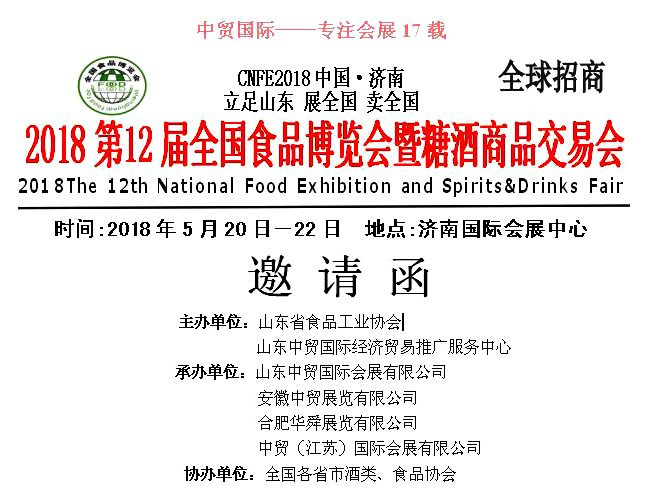 為推動中國糖酒食品行業快速發展,2018年5月20日繼續在濟南國際會展中心舉辦“2018第12屆全國食品博覽會暨糖酒商品交易會”,本屆交易會不論規模和檔次都將突破歷屆之最,歡迎廣大廠商前來參展、參觀!