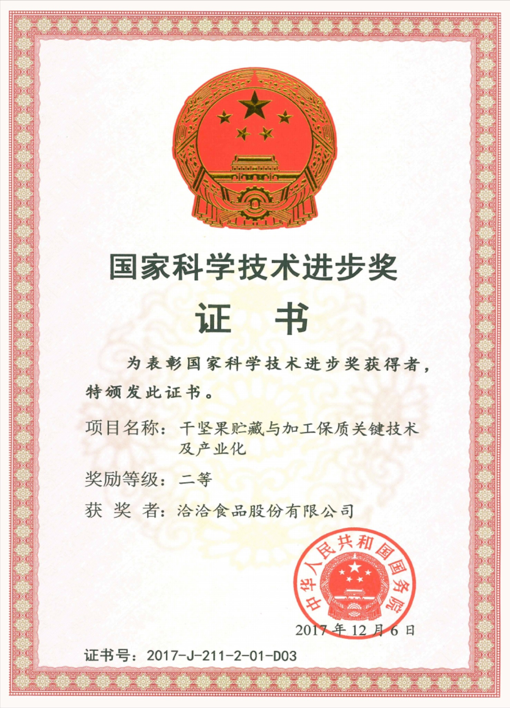 另一方面,洽洽食品持續提升專業技術水平,屢獲權威機構的認可。洽洽食品是農業部認證的“國家堅果加工技術研發中心”;洽洽參與的“干堅果貯藏與加工保質關鍵技術及產業化”項目獲得了由國務院頒發的國家科學技術進步二等獎,該獎項是國家科學技術獎5大獎項之一,只授予在研究、開發、創新、推廣應用先進科學技術成果、促進高新技術產業化等過程中做出創造性貢獻的中國公民和組織。此外,洽洽還先后獲得工信部認證的“2018智能制造試點示范”、“2018年制造業與互聯網融合發展試點示范”;食品工業協會頒發的“中國堅果炒貨食品行業具有健康價值與創新價值品牌產品”獎;洽洽小黃袋還成為首家入選國家健康品牌計劃的每日堅果品牌。