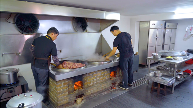 一鍋羊肉做得好不好,關鍵看火候,這是一個技術活,全靠廚師多年來積累的經驗和眼力。“全部制作完成需要三個多小時,燜煮的時候每二十分鐘就要翻炒一次,不同時間段的火候都不一樣,火太大太小都會影響肉質。”陳偉強說,因為羊只大小、脂肪含量等因素決定著火候的變化,所以只能依靠人工,機器是生產不出來的。