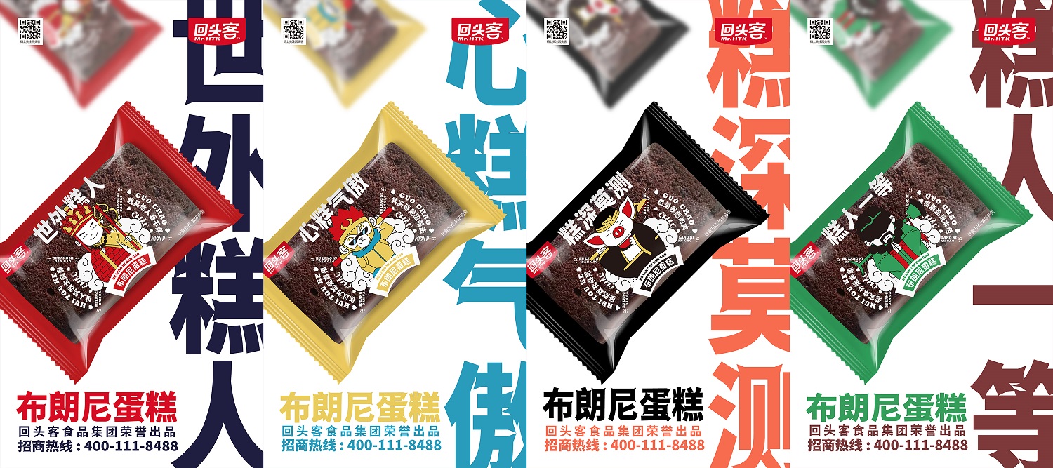 回頭客布朗尼蛋糕與西游記系列IP聯(lián)合,通過(guò)代表人物唐僧、孫悟空、豬八戒、沙僧的招牌形象,挖掘其潛在另類的心理特點(diǎn),對(duì)傳統(tǒng)形象進(jìn)行全新的解讀。例如,對(duì)豬八戒的人物描述為高深莫測(cè),在包裝呈現(xiàn)上,則將“糕”與“高”巧妙結(jié)合,用“糕深莫測(cè)”配以“雖然我長(zhǎng)得肥,但我想的美”的趣味文案。此外,孫悟空被定義為心“糕”氣傲,沙僧為“糕”人一等,唐僧為世外“糕”人,并分別配以有趣的解讀文案,讓人眼前一亮,辨識(shí)度極高。