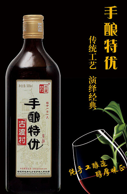 古渡村商標;源于長壽之鄉白蒲鎮古時候一渡口村莊。此村莊家家戶戶每年僅在春節釀造黃酒,迎送官府師友,納福賀歲。