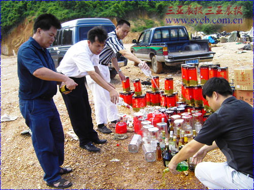 7月4日下午,在三亞市公安、監察、工商、衛生、新聞媒體等部門的監督下,一批假冒偽劣酒類商品在田獨垃圾場被公開銷毀。