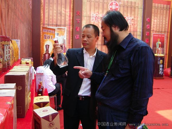 濟(jì)南秋季全國糖酒會上,山東諸葛亮家酒公司董事長能學(xué)廷(右)正在向深圳總經(jīng)銷羅永康介紹新產(chǎn)品。