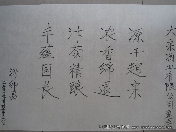 最后,他饒有興致地?fù)]筆為大宋酒業(yè)題提下“源于趙宋,濃香綿遠(yuǎn),汴菊精釀,風(fēng)蘊(yùn)園長(zhǎng)”十六個(gè)大字。