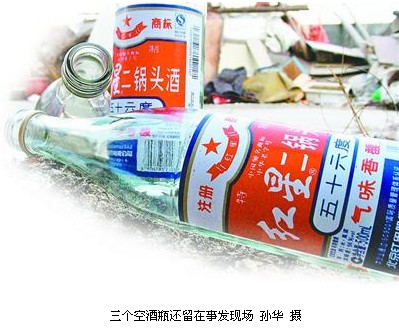 事發處是一間較為簡陋的平房,里面有一張床,一個破舊的沙發,一張小木桌和幾個小馬扎。小木桌上,一碟花生米剩下了幾粒,兩個打開的咸鴨蛋還未最后吃完。四瓶56度的二鍋頭白酒,三瓶已經空了,第四瓶已擰開蓋,只喝了一點點。