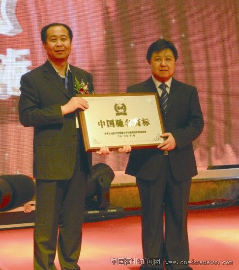 赤峰市工商局局長林樹均向內蒙古順鑫寧城老窖酒業有限公司總經理曹勇授予中國馳名商標牌。