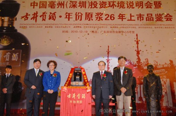 亳州市委副書記、代市長沈強(右二),深圳市人民政府副市長吳以環(左二),深圳市人民政府副秘書長盛斌(右一)等嘉賓在“古井貢酒__年份原漿26年”新品揭幕后留影。