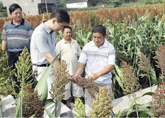2011年7月22日上午,宜賓江安縣怡樂鎮龍興村釀酒原料基地長勢喜人的高粱地里,龍興紅粱農民專業合作社的負責人在向前來調研的宜賓五糧液股份有限公司相關部門負責人介紹情況。近年來,宜賓市在著力打造“白酒之鄉”的同時,扎實推進 “白酒原料之鄉”建設,2011年宜賓釀酒專用糧生產基地種植高粱和糯米面積達到了32萬畝,特別是雜交高粱的種植面積和水平在全省領先,成為當地農民增收的新抓手。
