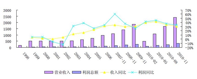 2010年國內白酒產量為890萬千升,同比增長26.8%;實現銷售收入2661億元,同比增長35.2%;2011年前三季度白酒產量714.05萬千升,同比增長29.2%;白酒行業完成銷售收入2483.55億元,同比增長39.2%。近十年來的增率如圖:
